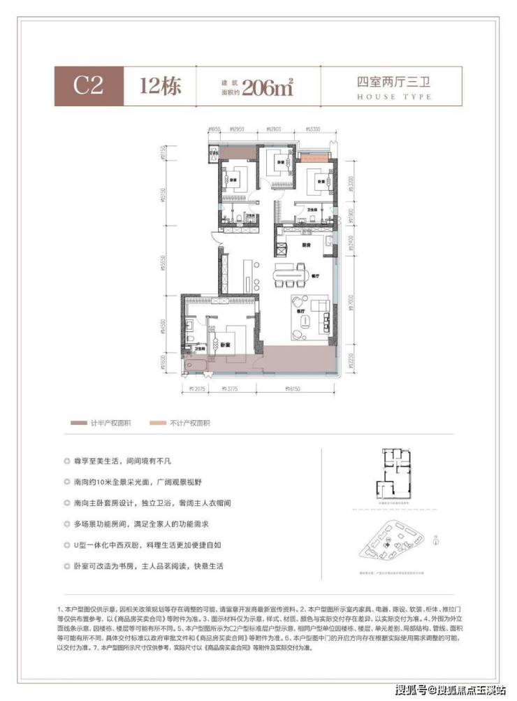 C1观境:建面约198㎡四房两厅三卫双套房北向揽景阳台,阔景视野,尽纳阳光清风南向约11.3m全景采光面,270°环幕视野奢雅主卧,臻配独立衣帽间、卫生间、浴缸次卧配置独立卫浴,衣柜区,尽显尊崇