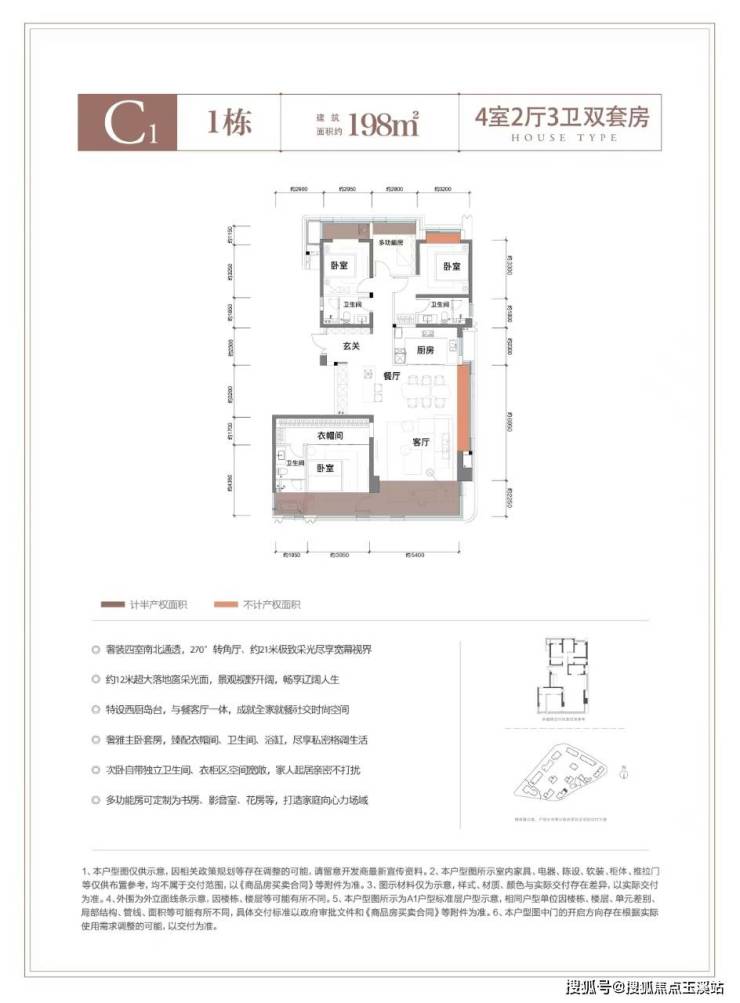 C1观境:建面约198㎡四房两厅三卫双套房