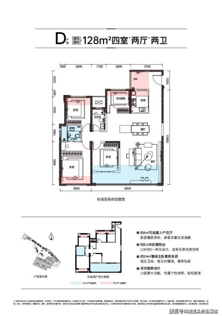 【D户型】四室两厅一厨两卫双阳台,建面约128㎡,实际使用面积约127.75㎡,实际得房率99.56%。