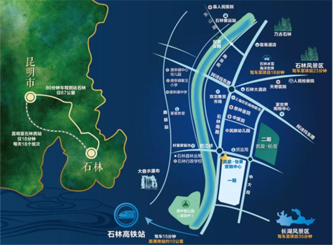 石林距离昆明高铁19分钟,位于昆明1小时经济圈内,得天独厚的区位优势,让石林共享昆明配套。特别是医疗条件方面,相比版纳、丽江、大理等城市,同级别配套就略显乏力。