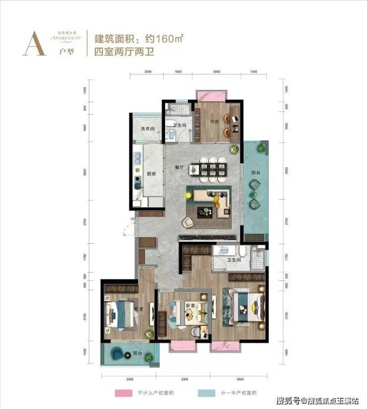 A户型:建面约160㎡,四室两厅两卫