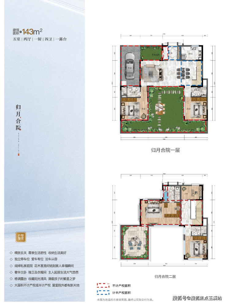 合院143产品:嵩山溪谷143㎡的产品,是五房两厅一厨四卫一花园的设计,还有160㎡的不记产权面积(一楼的花园、独立车库、二楼的主卧、过道、露台都是全赠送;一楼的厨房跟餐厅半面积赠送),实得面积约300㎡,还有院子里的独立车库。