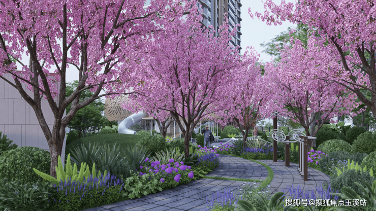 【微风花园】樱花树下的秋千摇曳着浪漫,康体器械陪伴着老人悠然自得。