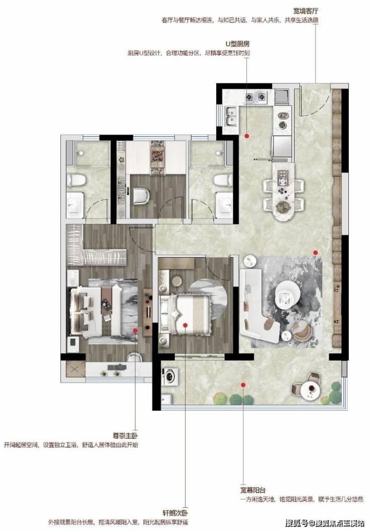 户型亮点:格局方正+约6.5米瞰景阳台+U型厨房紧邻餐厅+主卧套间设计