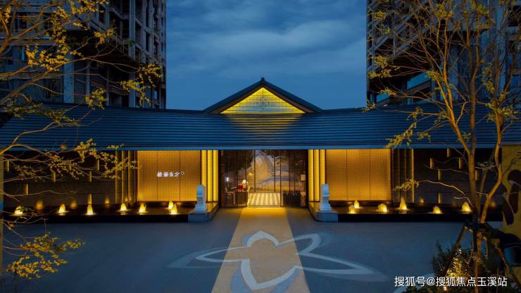 特色铺装折桂路延伸至中式贵气桂华门。金属瓦屋面的坡屋顶,搭配海蓝宝石材装贴,尽显高贵与典雅。