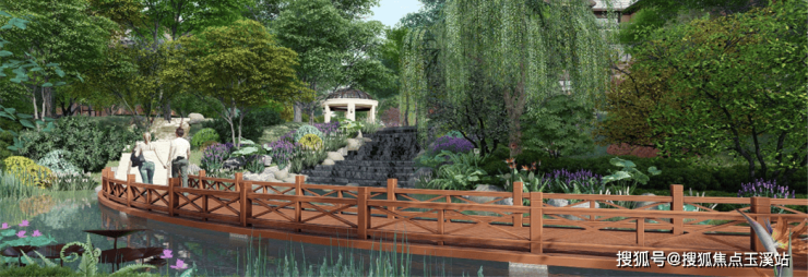 核心景观轴划分休闲嬉水空间、溪流跌水、水上栈道空间、亲水码头空间、廊间小憩空间营造高端浪漫的溪居生活环境。两侧此景观轴线,以儿童亲子乐园为主,有趣的园区和以休闲游园为主,静谧舒适的康养主题园区。