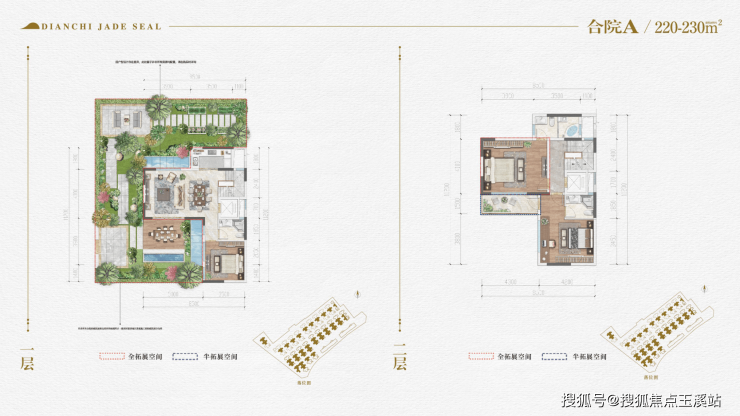 合院A户型:产权面积230平,花园面积:20-80平,实体院墙围合花园,带车位,价格:650-1000万,独立花园