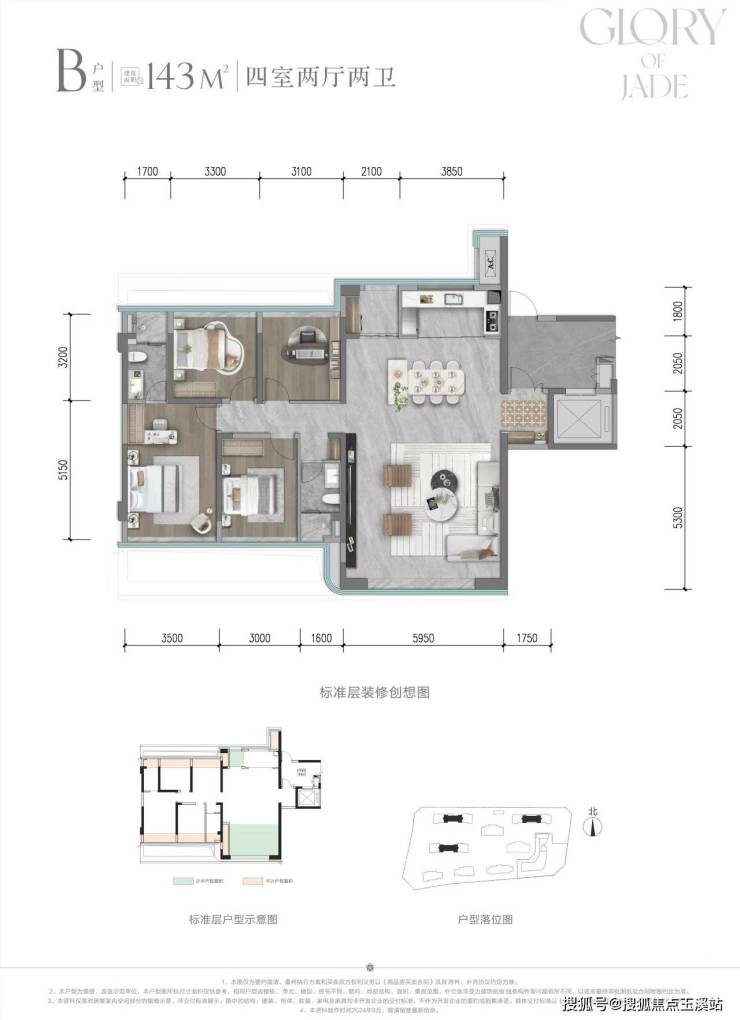B 户型:建面约143 ㎡中户实得约 139 ㎡,得房率约 97%,户型方正利用率高