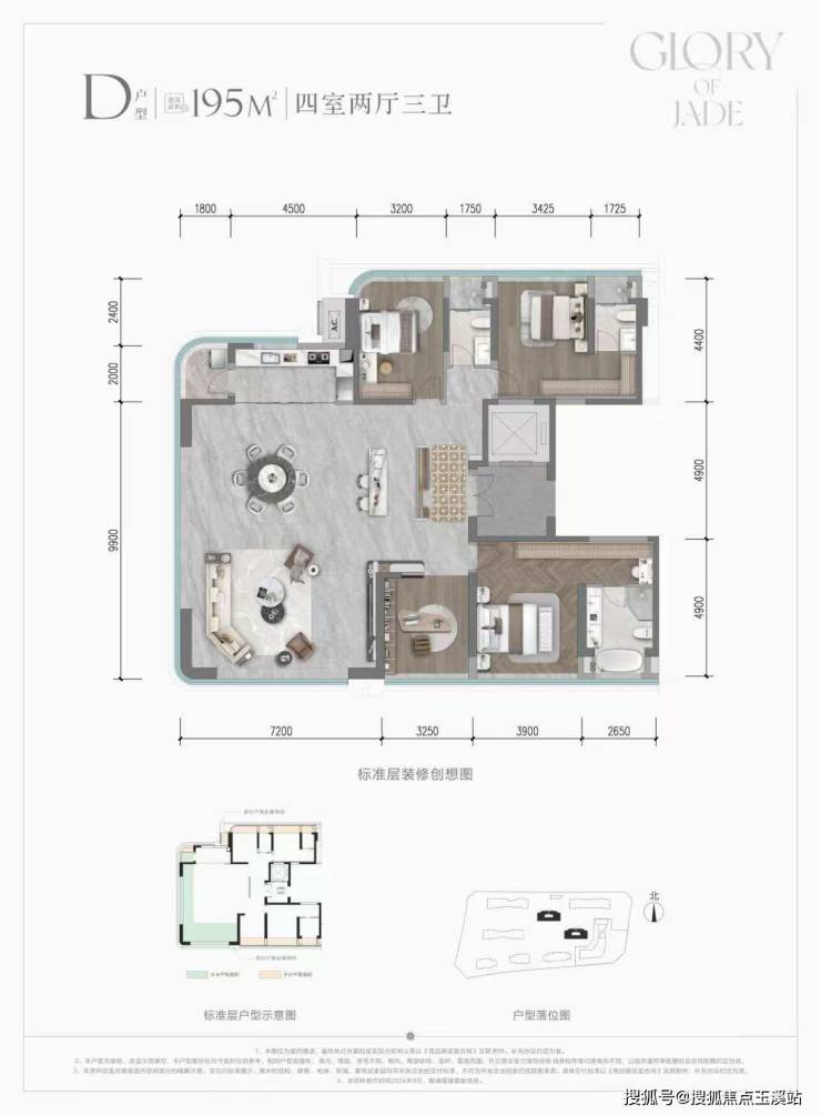 D户型:建面约195 ㎡实得约 192 ㎡,得房率 99%,楼王全景舱大平层