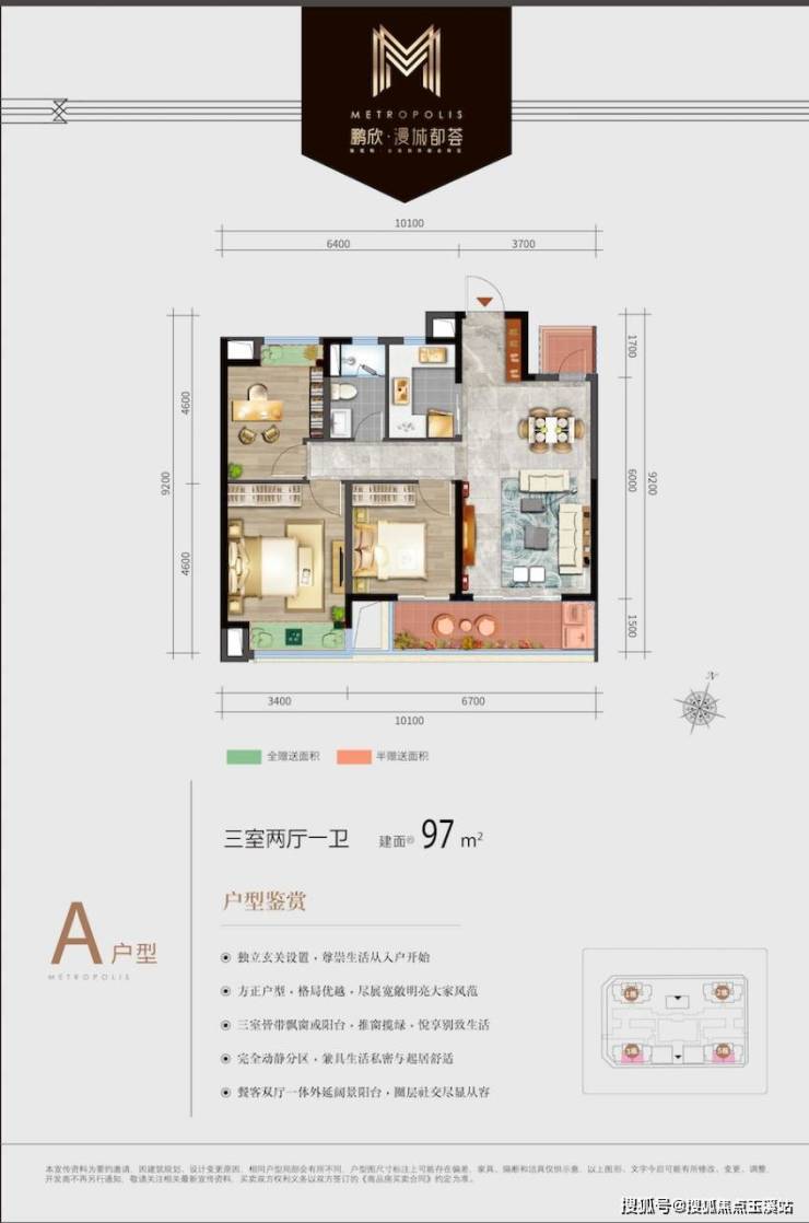- **97平方米三房**:采用横厅设计,南向面宽达6.8米,实现83%得房率