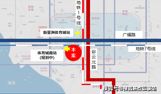 地铁:1号线可到达新亚洲体育城可到达项目,7号线正在修建中,立体轨道交通交汇