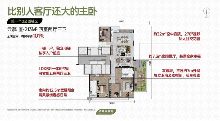 云慕(约213㎡):四室两厅三卫,楼王户型,独立电梯入户,双主卧套房设计,拥有约100㎡级寰景社交厅。