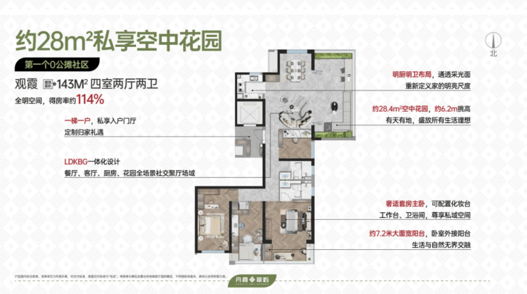 “0公摊”设计:通过大面积赠送空中露台、阳台半面积计算等方式,部分户型得房率宣称可达101%-114%(如143㎡户型),实际使用面积大于产权面积。