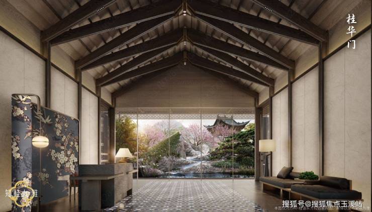 透过玻璃,中式园林的山水大观跃然眼前,引领您步入一个诗意盎然的世界。