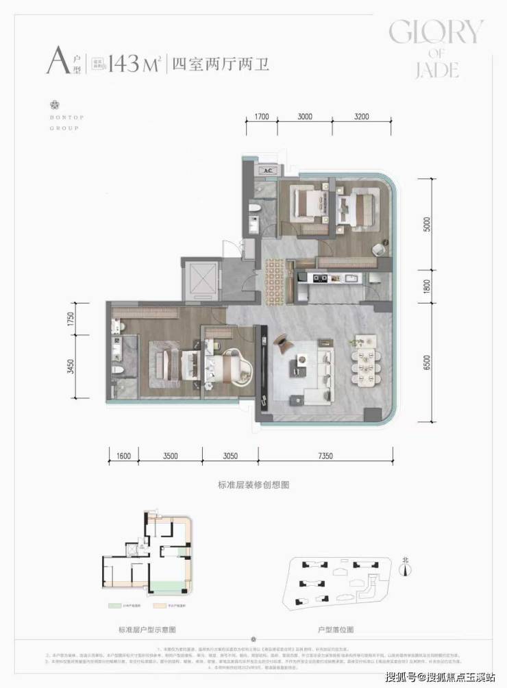 A 户型:建面约143 ㎡端户实得约 140 ㎡,得房率约 98%,270°全景舱户型