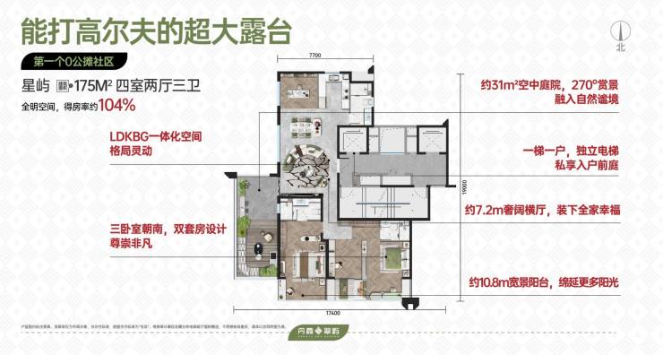 星屿(175㎡):四室两厅三卫,得房率超104%,空间利用率极高。