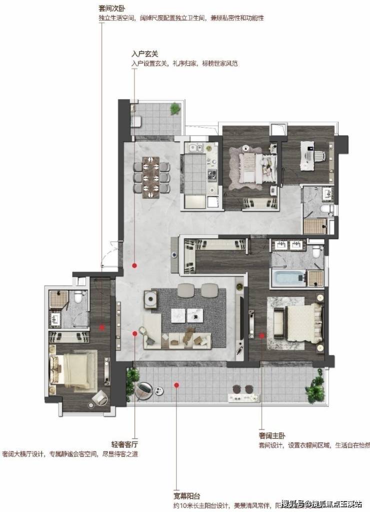 户型亮点:动静分区合理布局+约10.4米揽景阳台+独立入户玄关+双套房设计