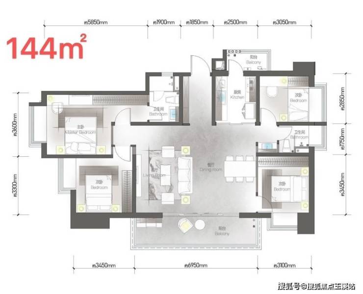 万川:建面约144㎡,四室两厅一厨两卫双阳台