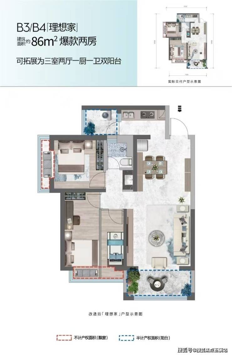 楼栋为蝶式设计,3梯6户,层高2.9米,容积率3.48。户型均为两室两厅一厨一卫,单套户型建筑面积为84.86-89.88㎡。