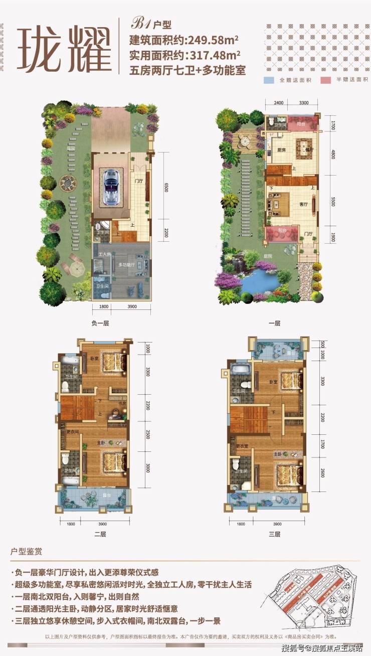 目前市面上少有的双拼产品,除了前后花园外,带有电梯入户,同样是地下1层地上3层的结构,户型面积290㎡,地下室赠送约45㎡,露台阳台赠送约61平米,前后花园赠送面积约220㎡。