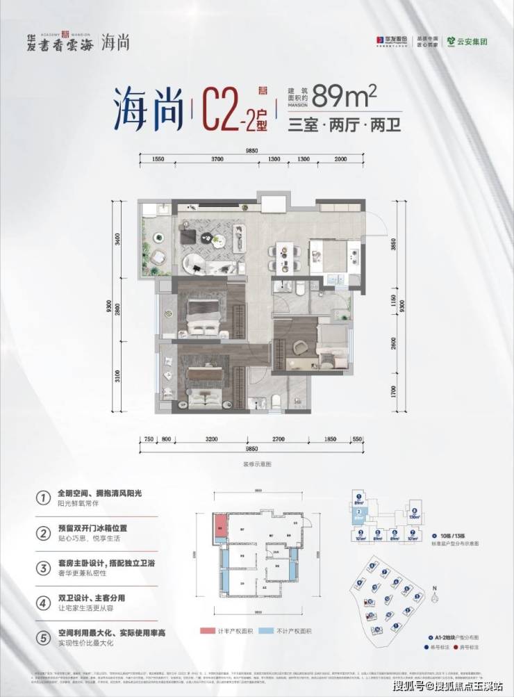 三房两卫双阳台89㎡,南北,可观滇,端户:98万~103万,中户:西南向,均价:110万左右