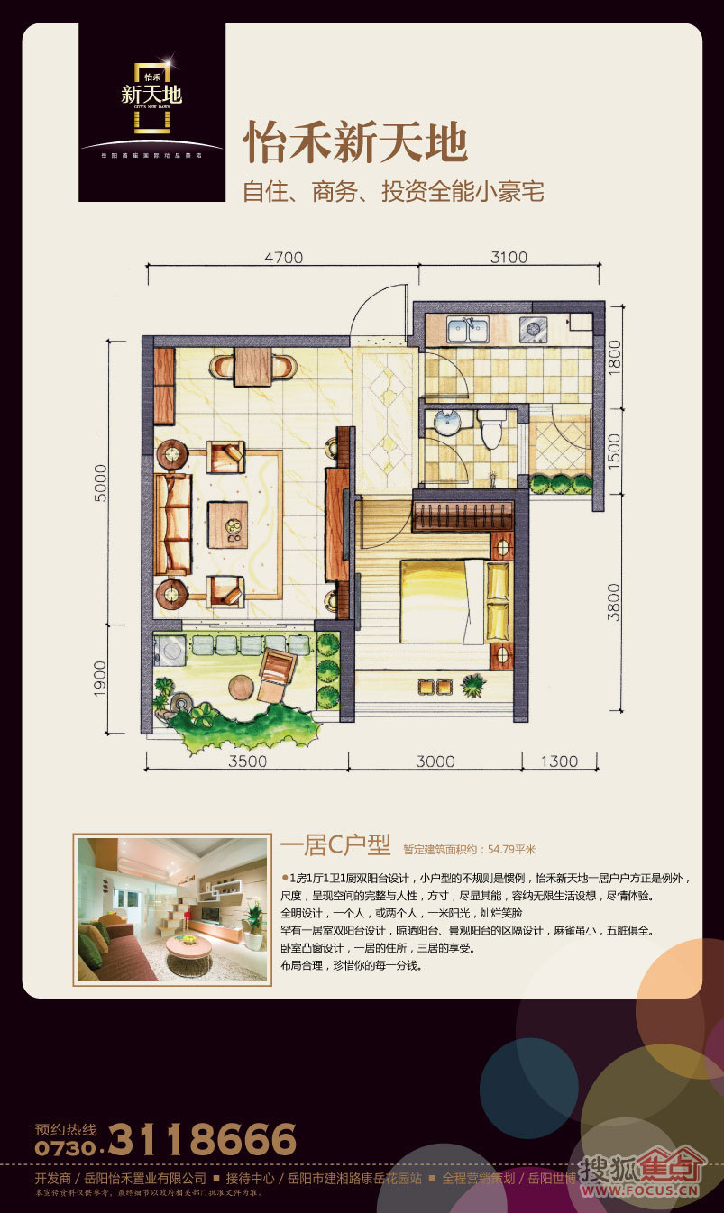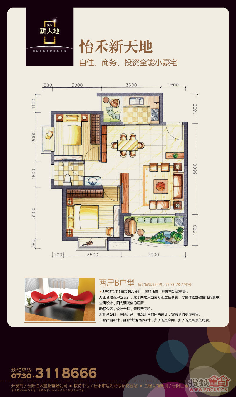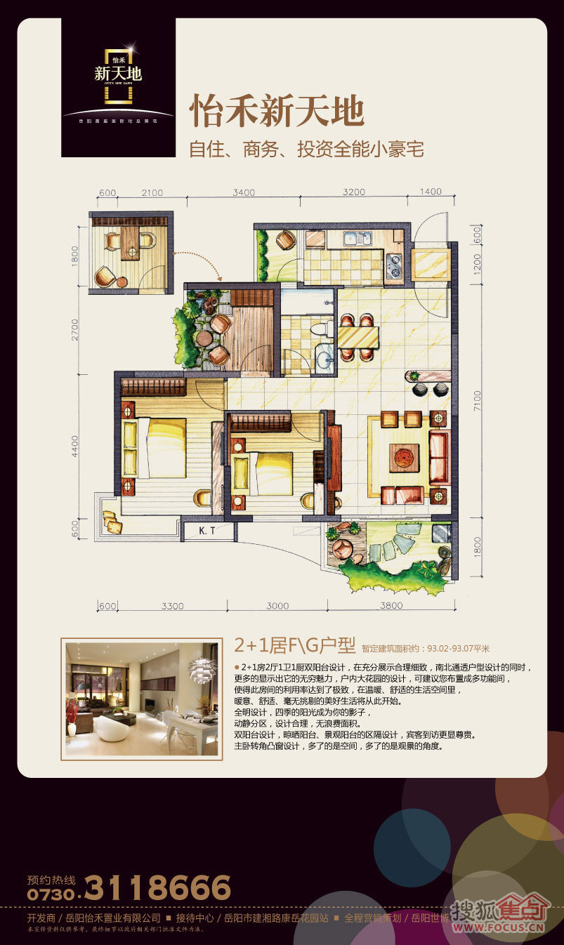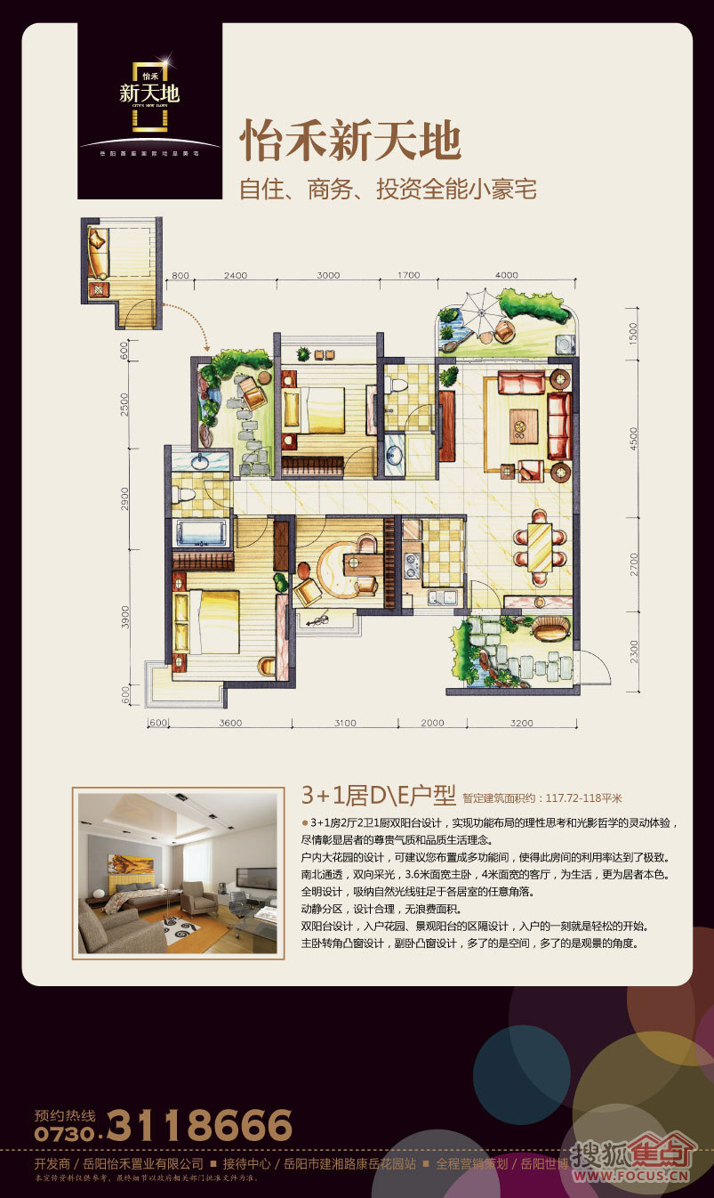 怡禾新天地定位于岳阳科技、低碳、环保美宅,将打造成智能化的精品项目,智能安防上采用9重智能安防系统,中庭园林内安放电子生态灭蚊系统(岳阳首创),为业主提供安心、舒适的居住环境。项目规划有55平方米—118平方米的一房、二房、2+1房、三房、3+1房,其中2+1房、3+1房为买2房用3房、买3房用4房的创新户型。