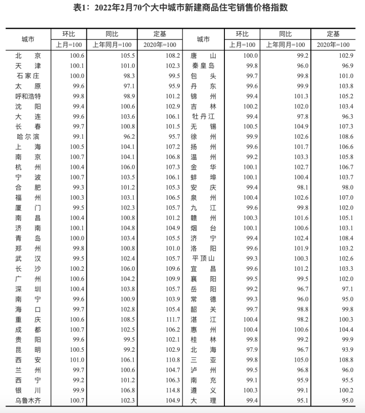 3月16日,国家统计局发布2022年2月70个大中城市商品住宅销售价格变动情况。数据显示,2022年2月份,新建商品住宅价格上涨城市数量为27个,较1月减少1城;持平城市为3个,与上月一致;下跌城市40个,较上月增加1城。从2月份二手住宅房价指数来看,房价上涨城市数量为10个,与上月保持一致;持平城市3个,较上月减少1个;下跌城市57个,比上月增加2个。