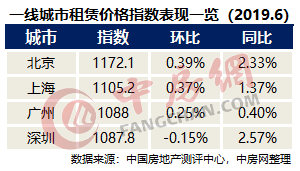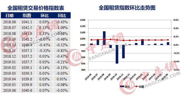 中国房地产测评中心近日发布的《2019年6月中国城市租赁价格指数报告》显示,6月份中国城市租赁价格指数为1040.6点,较上月上升0.7点,环比上涨0.07%,同比跌幅0.05%。