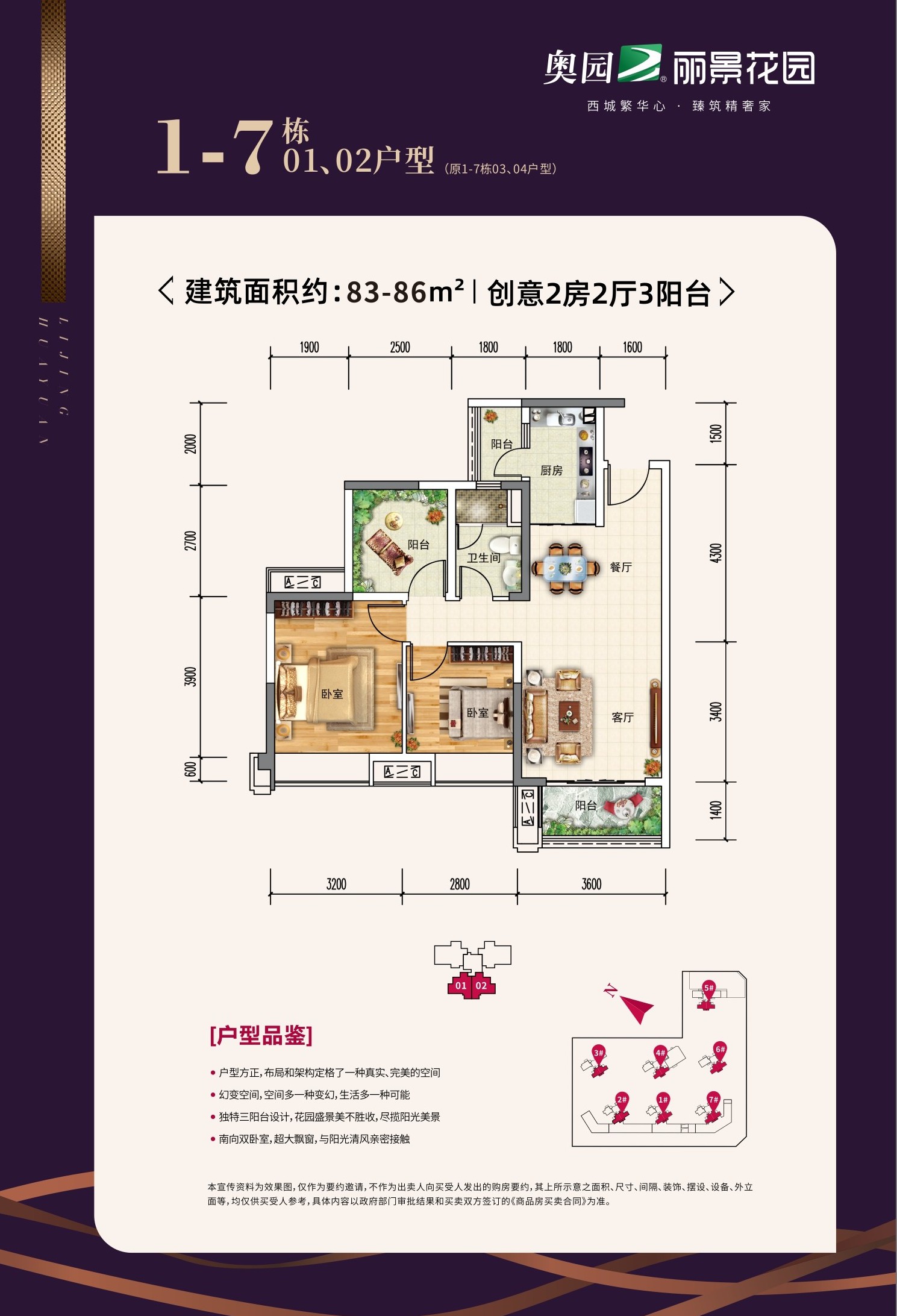 奥园丽景花园小区占地面积2.8万平方米,总建面6.5万平方米,总户数464户,地上停车位59个,地下停车位422个,绿化率达到35%,容积率仅为1.6,我们的项目共8栋,整体分为两个业态,其中住宅产品为1-7栋,均为2+1或2+2创变户型;8栋为2层商业,另外包含1栋、2栋、7栋1层住宅底商。小区住宅整体呈两排设计,前排与后排错开而建,5栋位于北侧,整体布局使得每一栋的采光通风效果、视野得到较好的享受。小区有两个车行路口,南侧的河坊路和西侧规划路各一个,采用人车分流设计,一方面能减少粉尘,噪音的影响,另一方面也保证了小区的安全性。