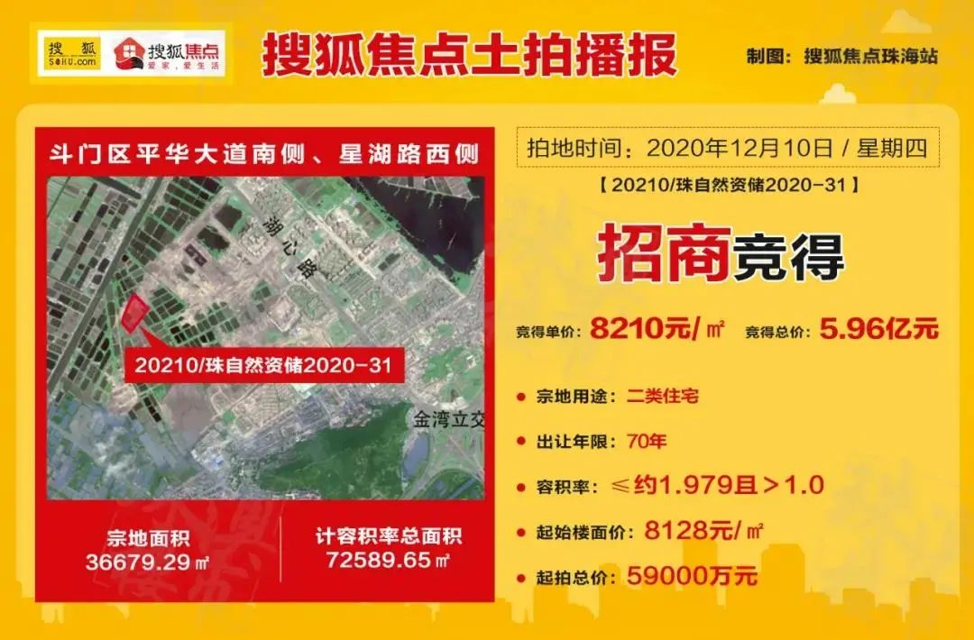 12月10日,招商蛇口以总价5.96亿、楼面价8210元/㎡成功竞得斗门区平华大道南侧、星湖路西侧纯住宅地块,落子湖心新城。
