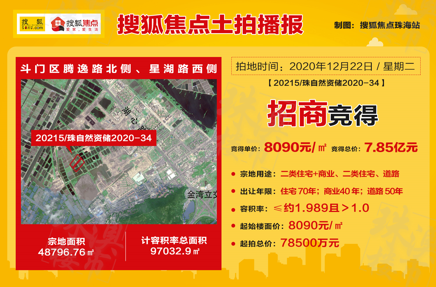 成交!刚刚,招商以总价7.85亿、楼面价8090元/㎡竞得斗门西部中心城A片区地块!