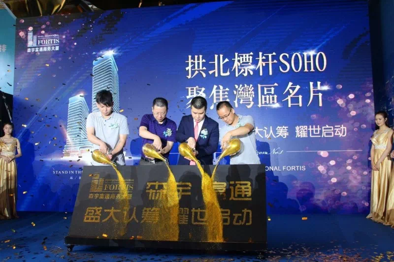 在现场嘉宾的注视与掌声中,一众领导手握沙壶,金沙洒落,闪亮森宇富通圆满礼成。这寓示着森宇富通商务大厦,认筹正式盛启!
