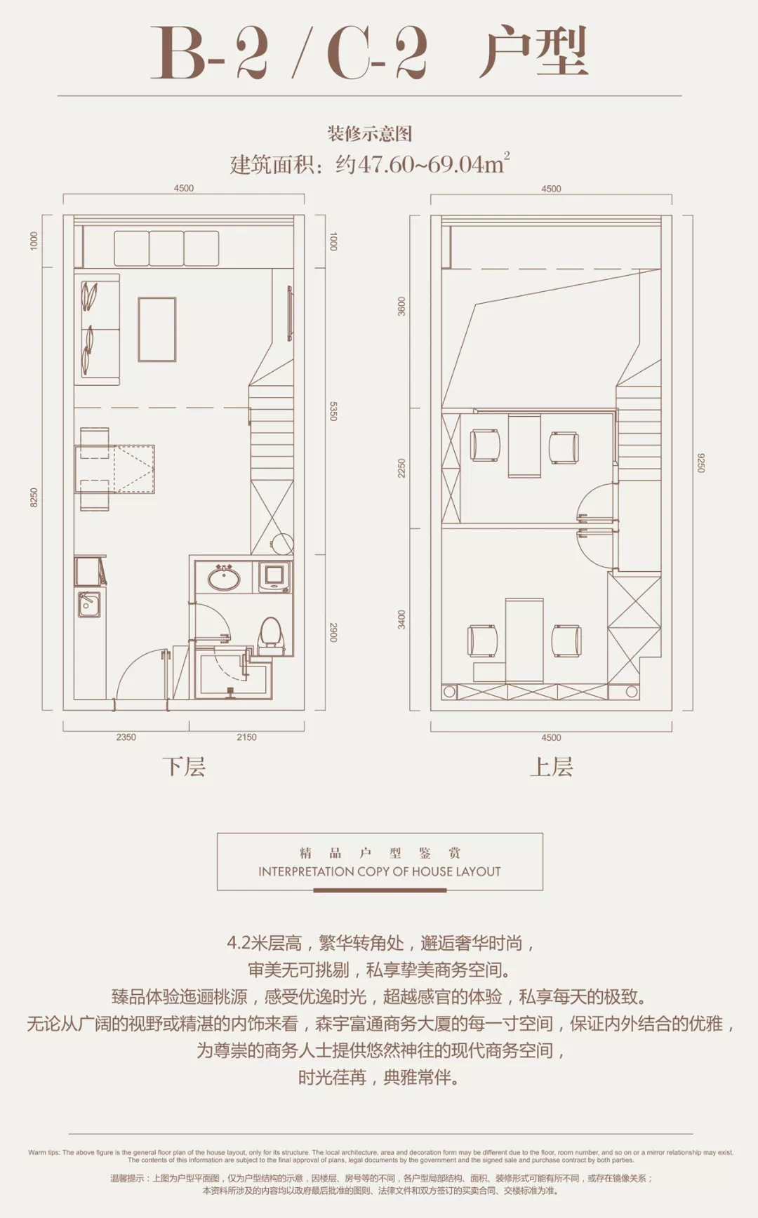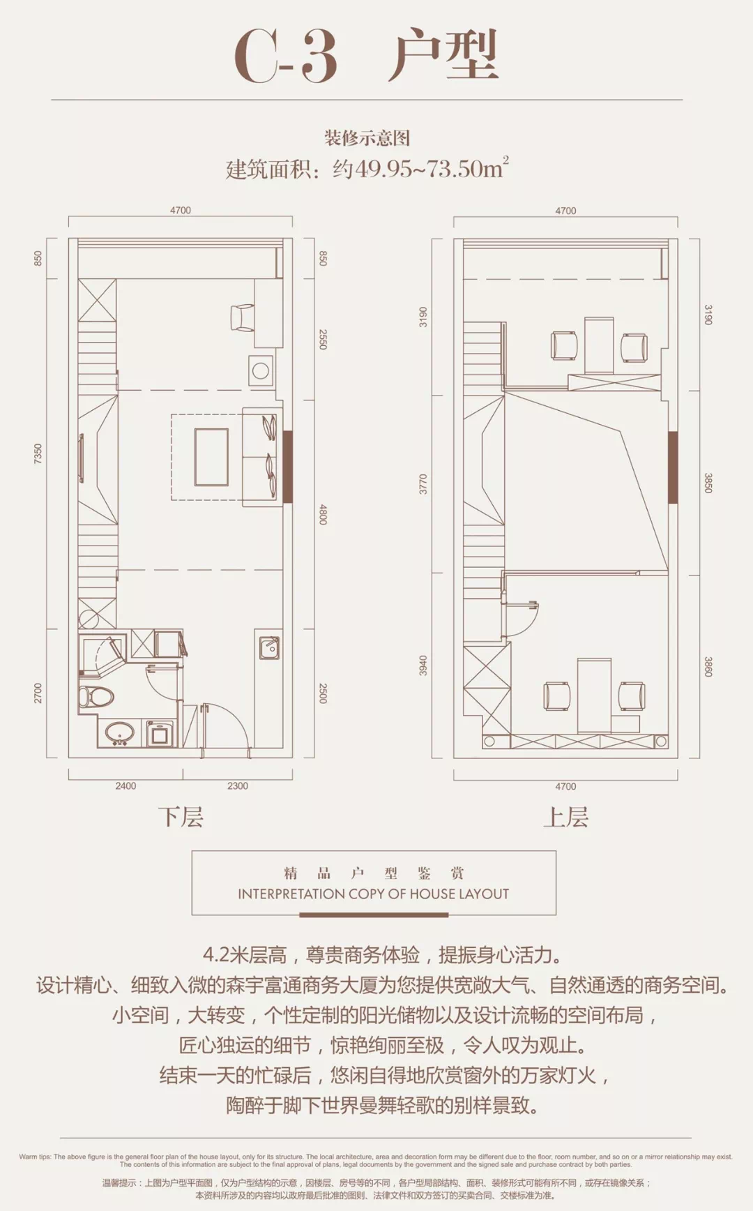 项目2栋22层,规划为酒店式办公,户型面积约37-73㎡,4.2-4.6米层高,配有独立酒店式大堂。全球五大品牌物管之一—仲量联行提供高端增值服务,全方位资产管理,深度诠释层峰人士的身份地位,每一寸空间,匠心独运,保证内外结合的优雅,为尊崇的商务人士提供悠然神往的现代商务空间。