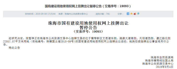 据悉,地块首次挂牌出让时间为今年8月6日,经历一次延期后,于9月4日暂停出让。