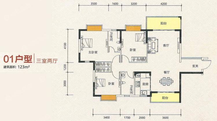 15、16号楼01户型-3室2厅2卫-123.0m²(建面) 在售