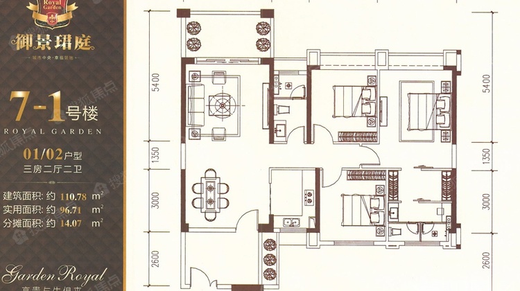 7-1号楼01/02户型三房两厅两卫建筑面积约110.78㎡实用面积约96.71㎡分摊面积约14.07㎡
