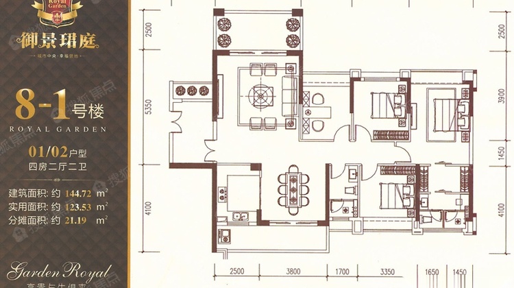 8-1号楼01/02户型四房两厅两卫建筑面积约144.72㎡实用面积约123.53㎡分摊面积约21.19㎡