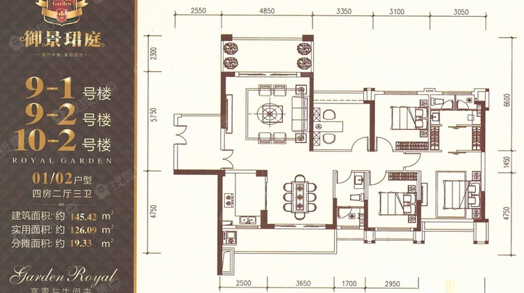 9-1号楼/9-2号楼/10-2号楼01/02户型四房两厅三卫建筑面积约145.42㎡实用面积约126.09㎡分摊面积约19.33㎡