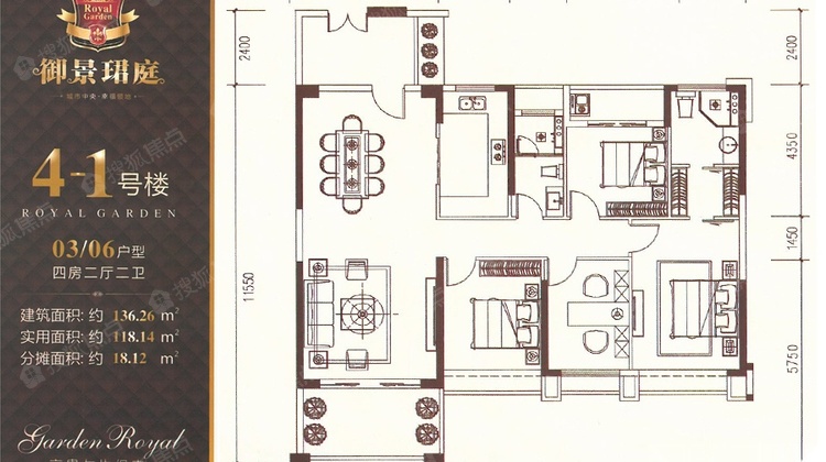 4-1号楼03/06户型四房两厅两卫建筑面积约136.26㎡实用面积约118.14㎡分摊面积约18.12㎡