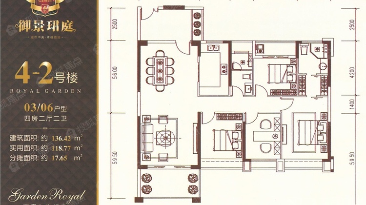 4-2号楼03/06户型四房两厅两卫建筑面积约136.42㎡实用面积约118.77㎡分摊面积约17.65㎡