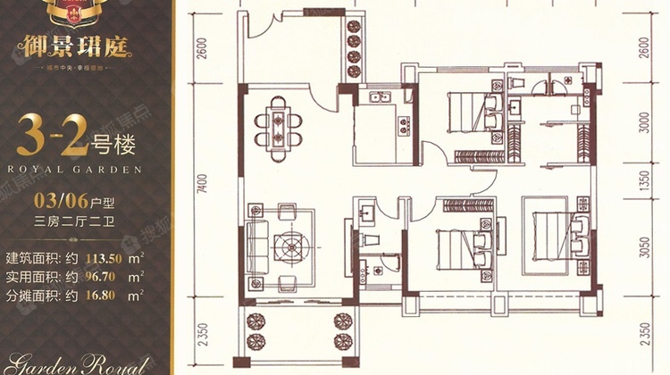 3-2号楼03/06户型三房两厅两卫建筑面积约113.50㎡实用面积约96.70㎡分摊面积约16.80㎡