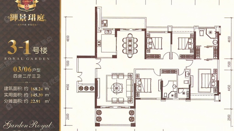 3-1号楼03/06户型四房两厅三卫建筑面积约168.24㎡实用面积约145.39㎡分摊面积约22.91㎡