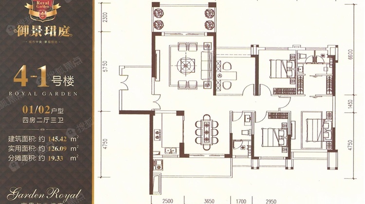 4-1号楼01/02户型四房两厅三卫建筑面积约145.42㎡实用面积约126.09㎡分摊面积约19.33㎡