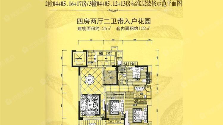 安康金海湾2幢04+05、16+17房/3幢04+05、12+13房标准层装修师范平面图四房二厅二卫带入户花园 建筑面积:约125㎡ 套内面积:102㎡