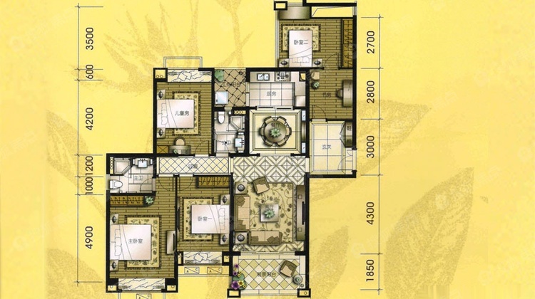 2幢09+10房标准层装修示范平面图 四房二厅二卫双阳台 建筑面积:140㎡ 套内面积:108㎡