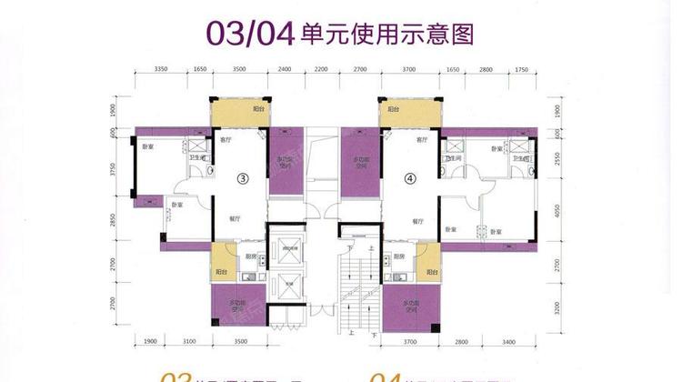 03单元户型:两房两厅一卫,建筑面积约84㎡,使用面积约97㎡ 04单元户型:三房两厅两卫,建筑面积约104㎡,使用面积约118㎡