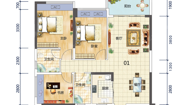 1012蓝海峰境-1栋01户型-3室2厅2卫-113.0m²(建面) 在售
