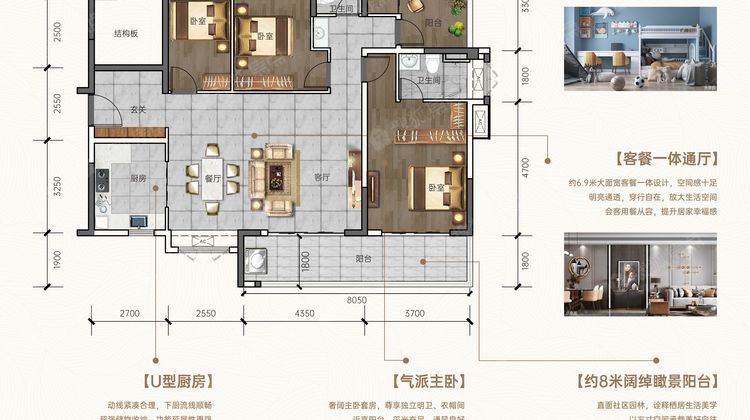 阔绰五房,约8.05米超长双联阳台,举目皆风景,同时兼具生活与观景的功能;超大横厅,减少过道浪费,容纳家人相聚时光与孩子娱乐时光,主客动线分离,更懂得家庭融合的生活方式。