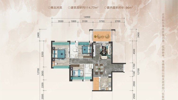 该户型布局精巧,方正舒适,尽显大宅风范。