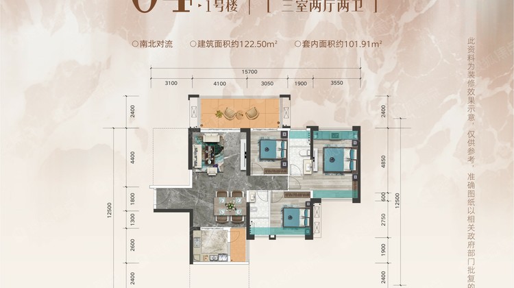 该户型客餐双厅联动,轩敞之余,揽境人生格局